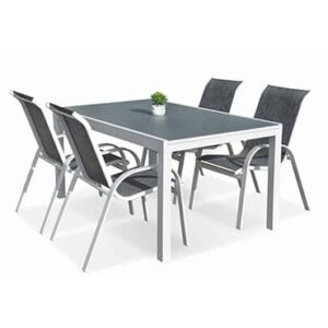Original price was: ₪ 1990.₪ 1290Current price is: ₪ 1290.- מסגרת לבנה, זכוכית אפורה, כיסאות לבנים בשילוב סלינג אפור