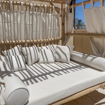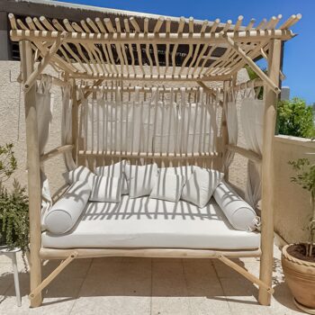 המיטה כוללת מזרון, כריות מרובעות תואמות ווילונות.