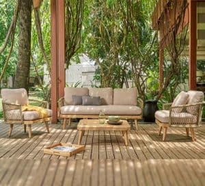 מערכת ישיבה מפוארת ומפנקת במיוחד. המערכת בנויה מספת תלת, 2 ספות יחיד ושולחן. שלדת עץ שיטה (בגימור גוון טיק) מלא ומאסיבי בחיפוי חבלי חוץ סינטטים. ריפודי חוץ מפנקים ורחיצים. צבעים: עץ בגוון טיק, חבלים צבע זית וריפודים בצבע בז’.