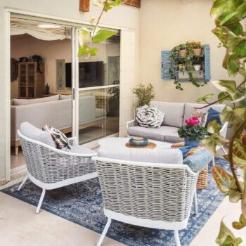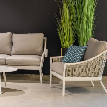 אלומיניום לבן, ראטן אפור, ריפוד אפור בהיר. אזל