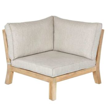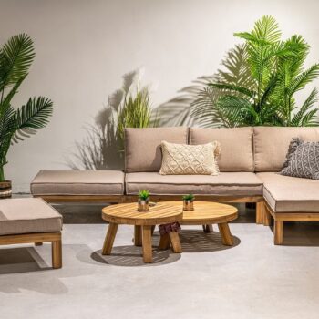 עץ שיטה מלא ומאסיבי בגימור צבע טיק מיושן, ריפודי אולפין ארוגים עבים ונוחים.