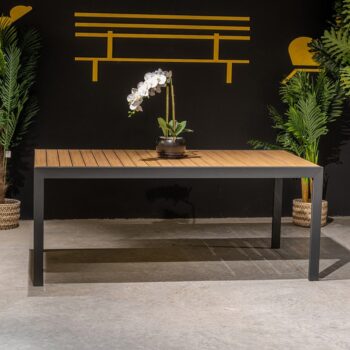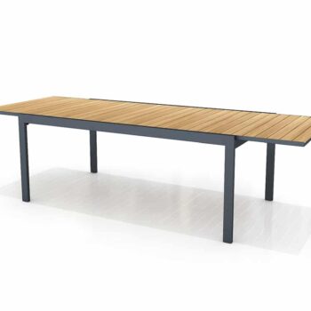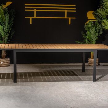 השולחן בנוי משלדת אלומיניום “אל חלד” בשילוב לוחות דמוי עץ.